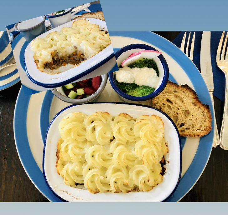 マッシュポテトを牛挽肉の上にのせ焼き上げたコテージパイ。イギリスの学校のランチやパブ、スーパーで目にしますよね。ほっこり甘いお味でした。タイムの香りがとってもよくって、私一推しの一品です!