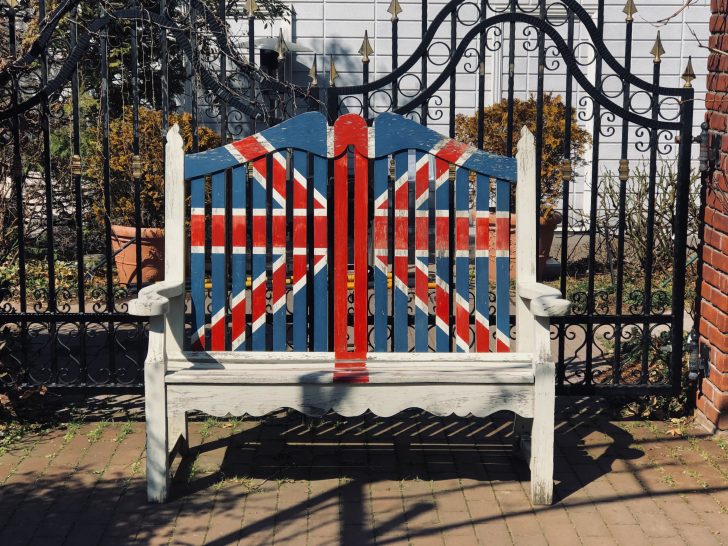 今回のコラムを掲載する前にSNSでこんな質問を投げかけてみました。ユニオンジャックをあしらったこちらの木の椅子。ガーデンシートだとお気づきになられた方が多数いらっしゃいました。