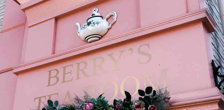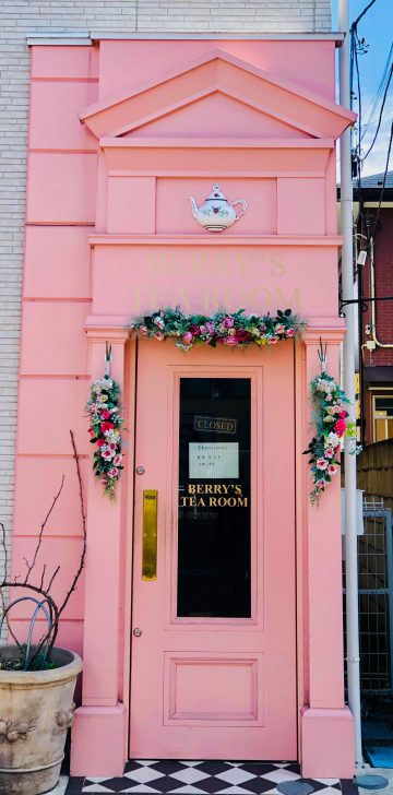 その街に、本格紅茶とイギリス菓子の店「ベリーズティールーム」さんがあります。浜田山駅を降りてメインロード商店街を入るとすぐに、ピンクのエントランスとシンボルマークのティーポットが突如現れます。華やかなピンクと商店街との思いがけないギャップが印象的で、ドアノブにかける手がますます緊張します。扉を開くと、階上まで導いてくれるピンクの一本道。さっきまで気になっていたギャップはもうどこかに忘れ去り、今日というティータイムを楽しもうと一段一段駆け上がっている自分がいました。
