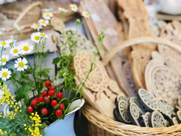 伝統工芸品「ベルプステ」:織り機でくるくる回る糸巻きをモチーフにして、太陽や花、魔除のシンボルなどを手彫りした飾り。