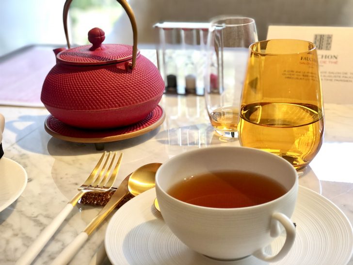 次に好みのお茶を用意してくれます。ひとつめは「ダージリン インペリアル」。驚いたのはピンクの「南部鉄器」の急須。目の前で繰り広げられるパリと京都のステージ。どっしりと重い急須で、インド産の華麗なお茶をいただきます。どこのティールームに行っても、紅茶のシャンパンと呼ばれるダージリンは必ずありますが、「茶の湯」をきっかけに江戸の世に誕生した「南部鉄器」でいただくダージリンは、より一層の深みとまろやかさを醸し出してくれます。