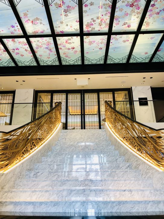 吹き抜けのロビーエントランスから続く大階段。パリを感じるエレガントな空間と、手摺りや天井に見られる京都らしい落ち着いたデザイン。さぁ11時です。一気にこの大階段を駆け上りましょう!