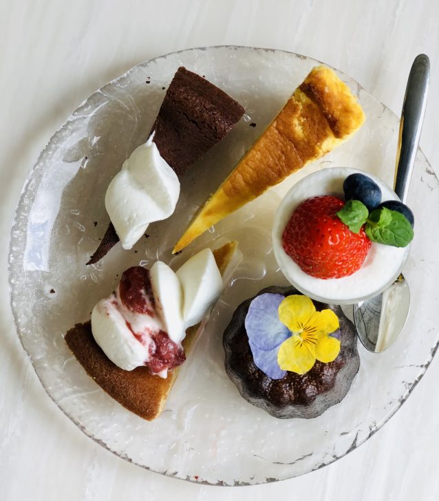しばらくすると年配の男性二人組が入店。常連さんのようでオーナーの阪本さんと仲良くお喋りされています。その後、男性陣はテラス席に着席。低糖質のランチとデザートのケーキを注文。さらに年配の女性客が一人。ランチと持ち帰りのデザートを注文。私も含め皆同世代。年を重ねると健康の配慮から砂糖の使用を控えることを意識します。砂糖を控える=砂糖への罪悪感という公式が頭の中を渦巻きます。しかし上昇値を表すGI値を意識した食材を目にすること、知ること、使ってみる、食べてみることで無理のない低糖質ライフが送れることを、このテラス席に通う常連さんに教えてもらったような気がしました。さあ!ただいまからシンレス流アフタヌーンティーの始まりです。