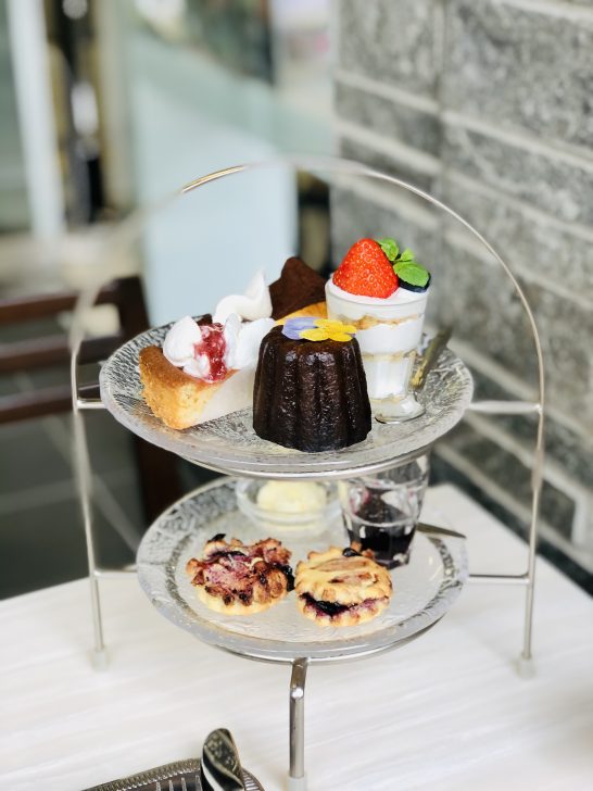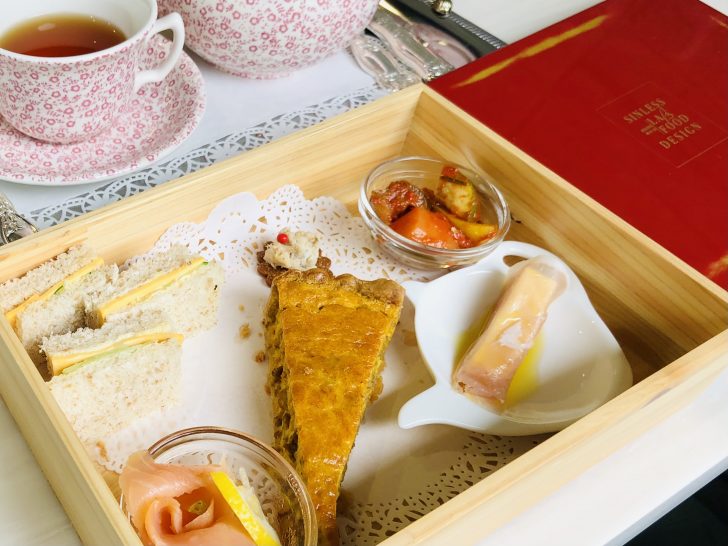 オリジナルデザインで運ばれてきたセイボリーの木箱に春の京都を感じます。続いて二段ティースタンドのスイーツたち。見た目にはなんら変わらぬスイーツですが、ここに阪本さんが研究に研究を重ね、緻密な栄養計算の結果完成したお菓子が並んでいます。