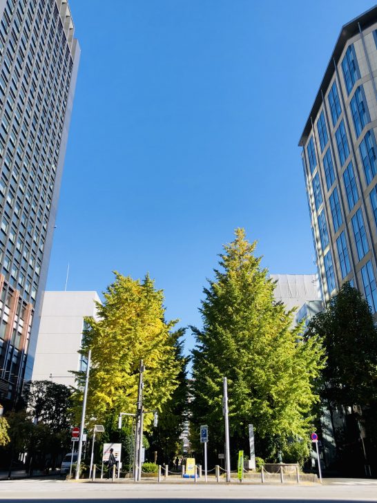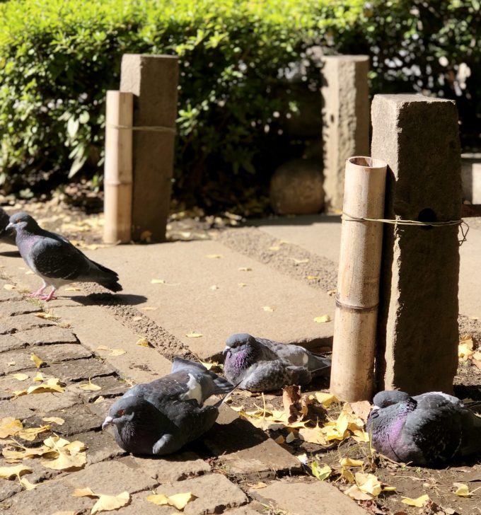 我が家からは都営新宿線浜町駅で下車。地上に上がると、日本橋地域の一角としてのオフィス街の中に銀杏並木がありました。この日はまだ11月10日。色づき始めた大きな銀杏の木の下で、鳩たちが日向ぼっこ。どんなに近寄っても微動だにせず気持ちよさそうに座っている(笑)。人馴れしているというより、この町に親しんでいる感じ (^○^)