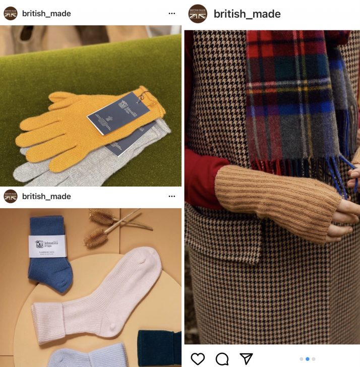 1月12日のインスタグラムでは、1797年、スコットランド北東に位置するエルガンで創業した老舗ブランド「ジョンストンズ」のアクセサリーが紹介されていました。ふっくらと暖かい、靴下、ストール、手袋、リストウォーマー。ジョンストンズンのカシミヤは、化学薬品がほとんど使用されていないので繊維へのダメージが少なく、私達が適切なお手入れをすればするほど長く愛用できるそうです。
