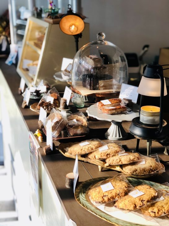 そしてワークショップの真横には、棚一杯に広がった米粉を使用した焼き菓子たち。本屋を運営するにあたり、複合的にいろんなテナントさんが入っているような本屋さんだったらいいのではないか、と考えた店主キムラさんは出店者を募集されました。その結果、イギリスはじめ欧米でも人気のグルテンフリーのお菓子を扱う「粉粉」さんが出店。「おやつは心の栄養」この言葉を胸に、毎日安全で優しい焼き菓子を提供しています。