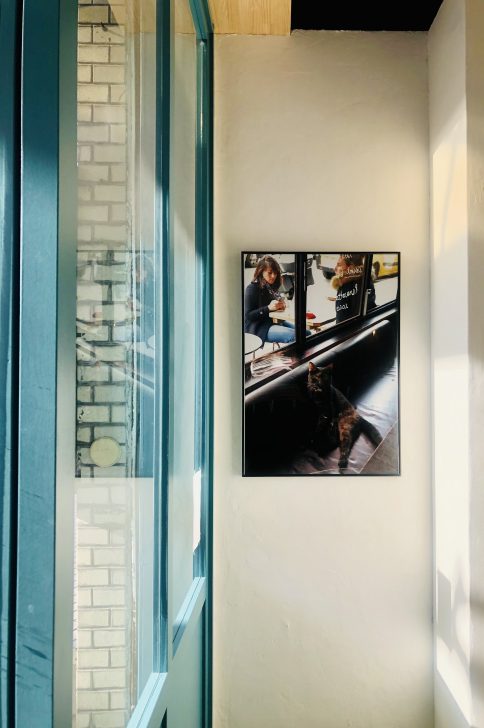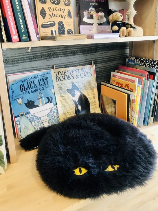 児童書が並ぶ中、1組の母娘さんが随分長く本を手に取っておられました。娘さんは座り込んで楽しんでいたよう。最後に店主キムラさんとお話をされてお店を出られました。ふと娘さんが座り込んでいた場所を見ると、なんと黒猫のクッションが!かわいい〜 (=^ェ^=) そして本棚には猫の本。先ほどティールブルーの外観の写真にも「ねこ」「絵本」とありましたね。猫の洋書和書もたくさん、ねこ専門店みたいに取り揃えておられます。「えっ!」と驚きや発見のある本屋さん。いろんな意味で長居してしまう♪ 母娘さんの気持ちがよ〜くわかりました(笑)