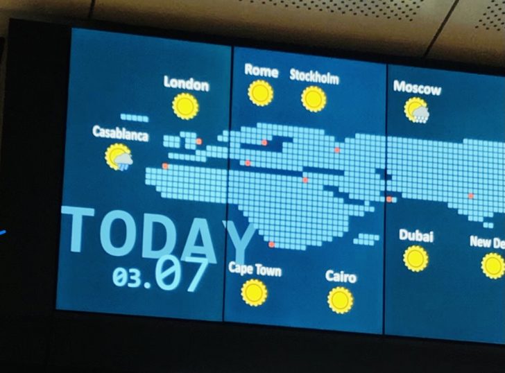 丸の内北口の改札を出た正面に現れた世界の天気図「today 3/7 ロンドン 晴れ」まるで歓迎されている気分♪