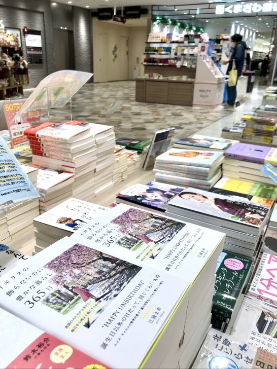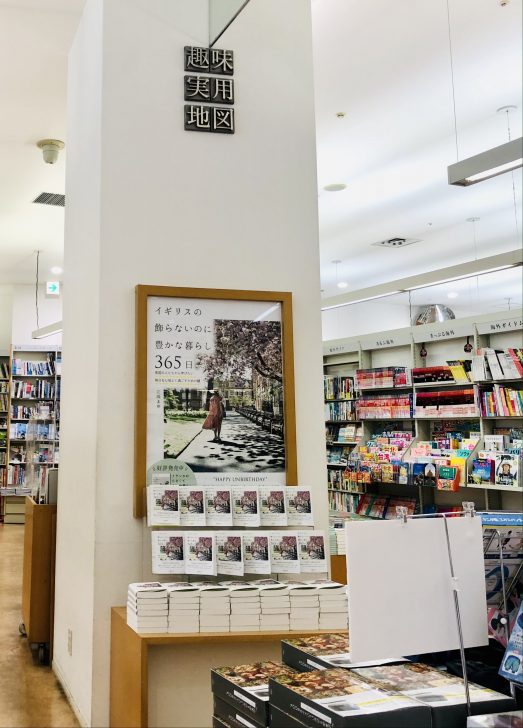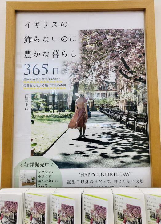 書店2階「実用」のコーナーへ。じゃじゃ〜ん!なんと大型ポスターに、縦に横にと平積みされた『イギリスの飾らないのに豊かな暮らし 365日』高い天井に真っ白な壁の特等席を埋め尽くしています。春色の表紙が眩しくて、どのくらいその場に立ち続けていたことか(笑)。手に取っておられるお客様の真横に並んで立ち、ただただ嬉しくて、重なる本を真上から真横から、斜めからと一緒に眺めておりました。