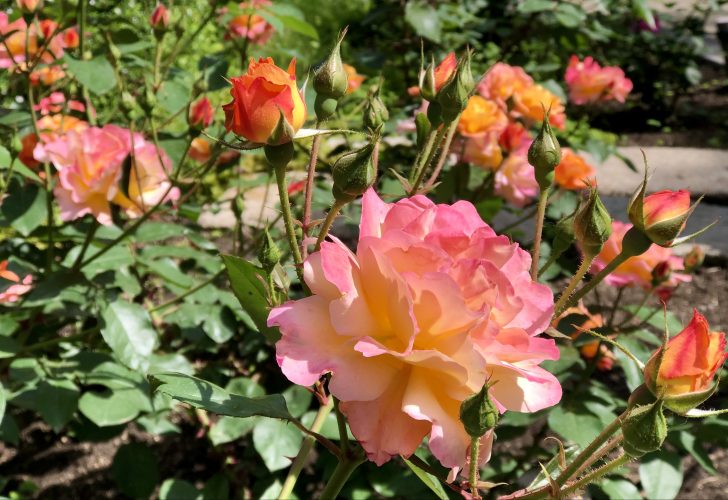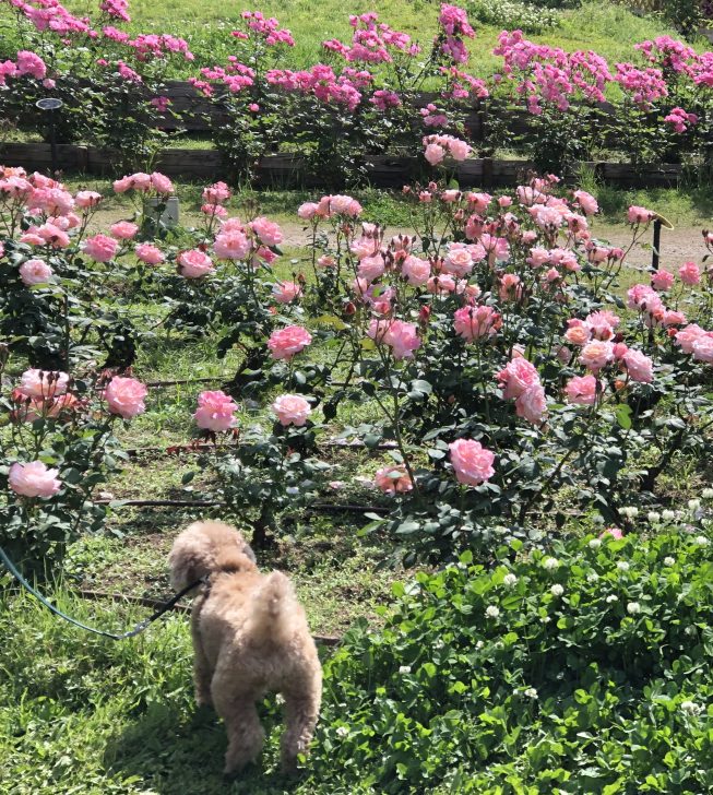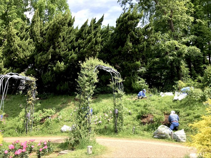 起伏ある自然の地形を生かし、滝やせせらぎ、噴水が涼しげな風を運んでくれます。イングリッシュガーデン風のバラ園とはちょっと違った魅力がありますね(バラはイングランドの国花です!)。美しいバラをカメラに収める人やバギーに乗った赤ちゃん。バラの花を嗅ぐ犬たちなど、園内は朝早くから爽やかな気分に包まれています。