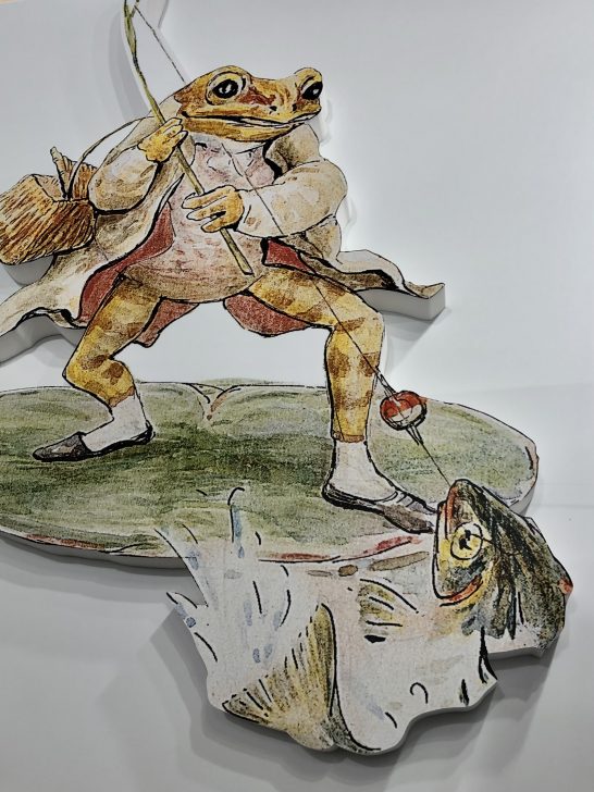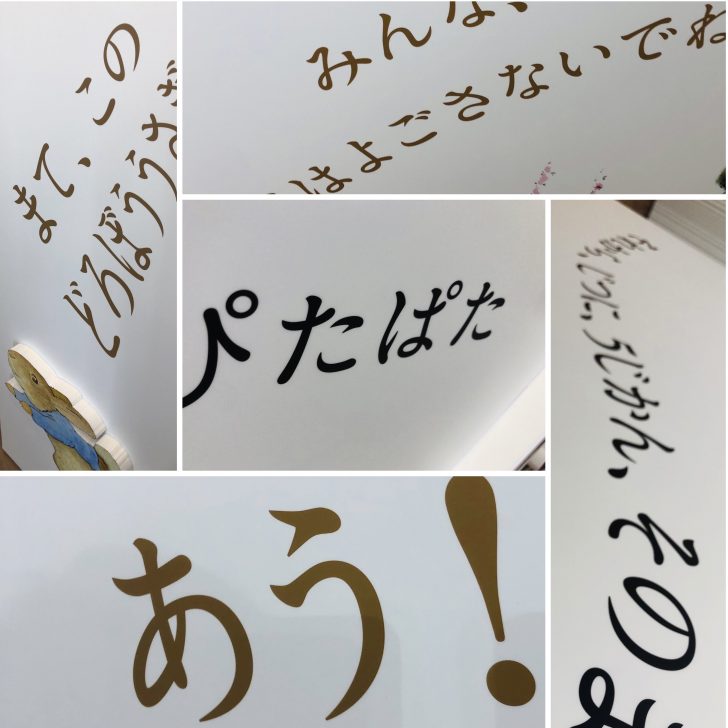 ここは「赤リスのナトキンのおはなし」や「かえるのジェレミーのおはなし」など、子供から大人までピーターラビットの世界を存分に堪能できるギャラリー。壁一面に描かれた絵本の仲間たち。平面もあれば凹凸もあるそのイラストは、今にも動き出すかのようです。また絵本から飛び出して語りかけてくる様々な言葉。「まて、このどろぼううさぎ!」の文字の大きさは声の強弱に。「ぴたぱた」の文字から想像する自分だけの音。「文字」がまだわからない小さな子供たちにとっても、読み聞かせをしてもらっている時の躍動感を感じることができるギャラリーです。