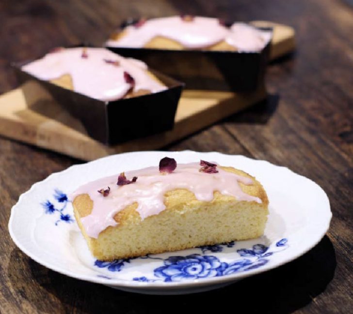 たっぷりのレモン果汁の生地とローズの夏らしいケーキ。ほろりとしたスポンジとアイシングの食感が楽しい。フォトジェニックなケーキです♪