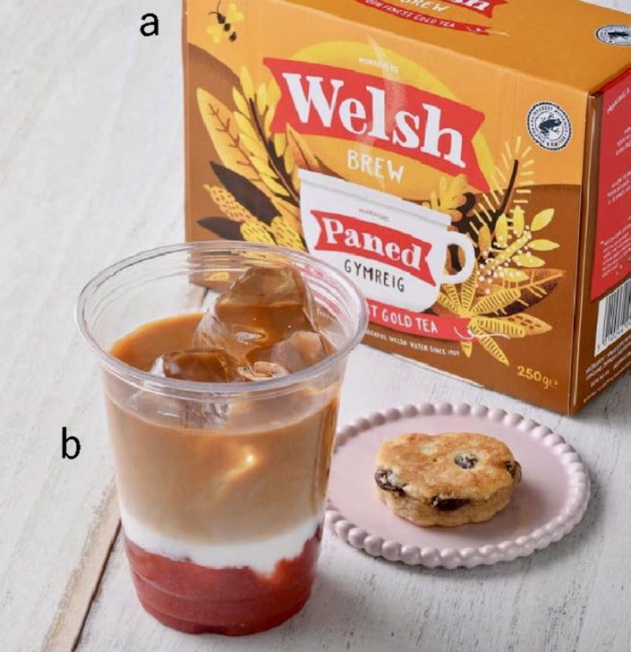 英国ウェールズのティーブランド「ウェルシュ・ブリュー」。軟水濃い目の紅茶に仕上がるウェルシュ・ゴールドをアイスティー用に抽出し、苺ピューレとたっぷりの牛乳を加えました。砂古先生が「ウェルシュ・ブリュー」に合わせて作った「ミニ・ウェルシュ・ケーキ」でウェルシュ・ティータイムをお楽しみください。