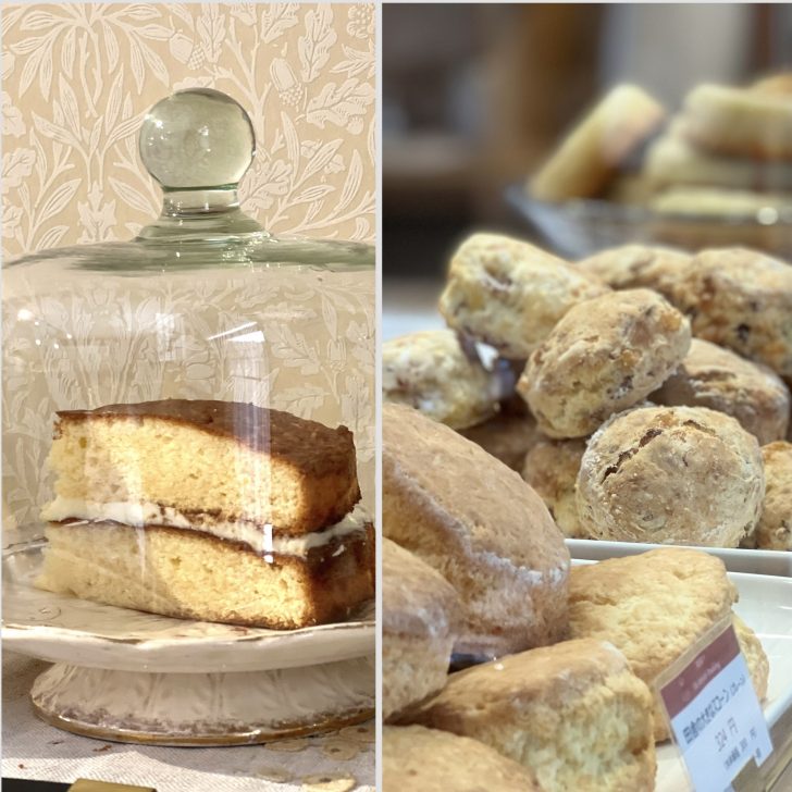 「田舎の大きなスコーン」はバターを一番多く使用しています。あたためて口に入れるとバターの香りが一面に。大好評のベーコンとチーズのお食事スコーン。塩気が夏の体に効きます!レモン&エルダーフラワーのケーキ。英国展ではジュビリーのピックが添えられるそうですよ♡