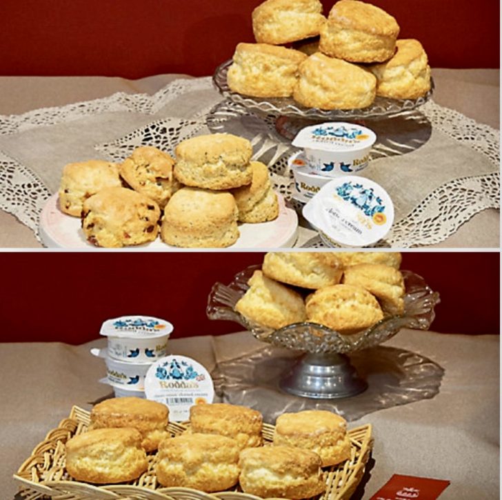 (上段)3種類のスコーン(田舎・紅茶・クランベリー)計12個とロダスクロテッドクリーム4個セット 5,210円(税込)