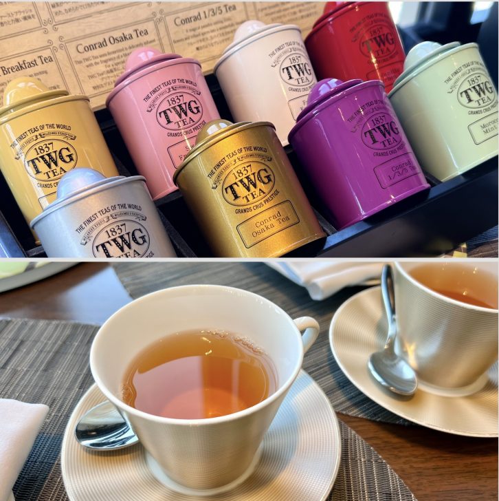 人気の「コンラッド大阪オリジナルブレンド」を含むシンガポール創業のTWG Teaや、コーヒーなどが好きなだけいただけます。やはり一杯目は人気のオリジナルブレンドティーをいただきました。烏龍茶とランの香りをブレンドした紅茶。心地よい香りが優雅なティータイムへと導いてくれました。