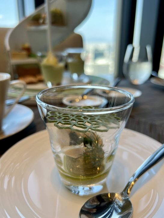 抹茶のチュイルが一際華やかだったチキンとピスタチオフムスのセイボリー。サクサクを予想していけれど、意外にしっかりしたチュイルでした。