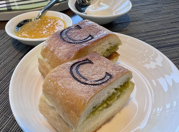 ホテル・アフタヌーンティーを物語る「C」の文字!セラーノハム、グリュイエールチーズ、ホワイトトリュフオイルとピスタチオのクリームが挟まった贅沢コンラッドホットサンド 。