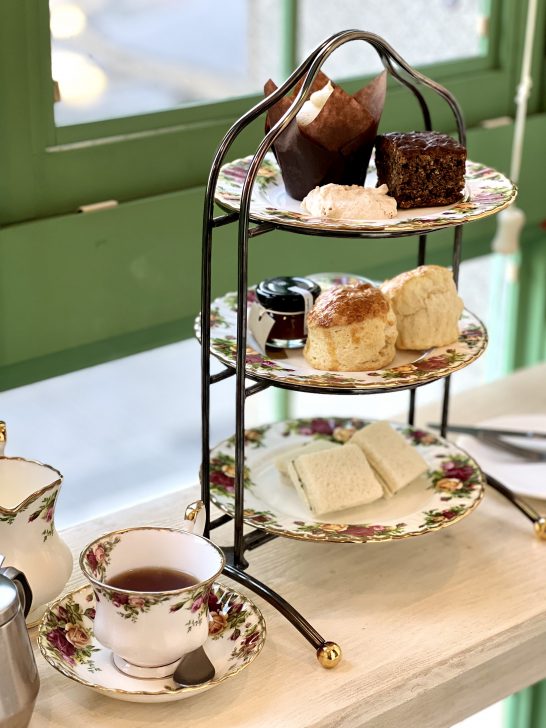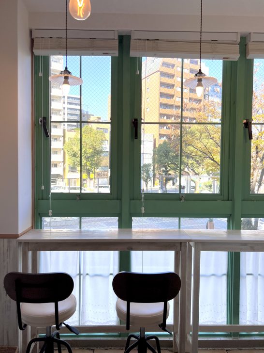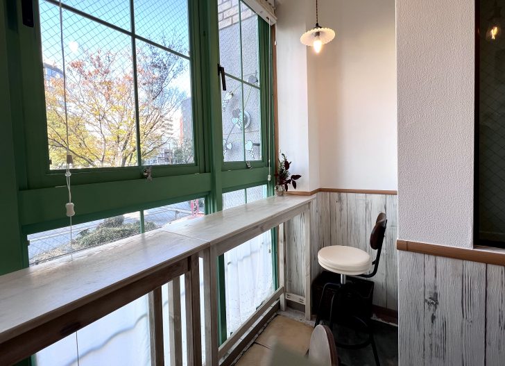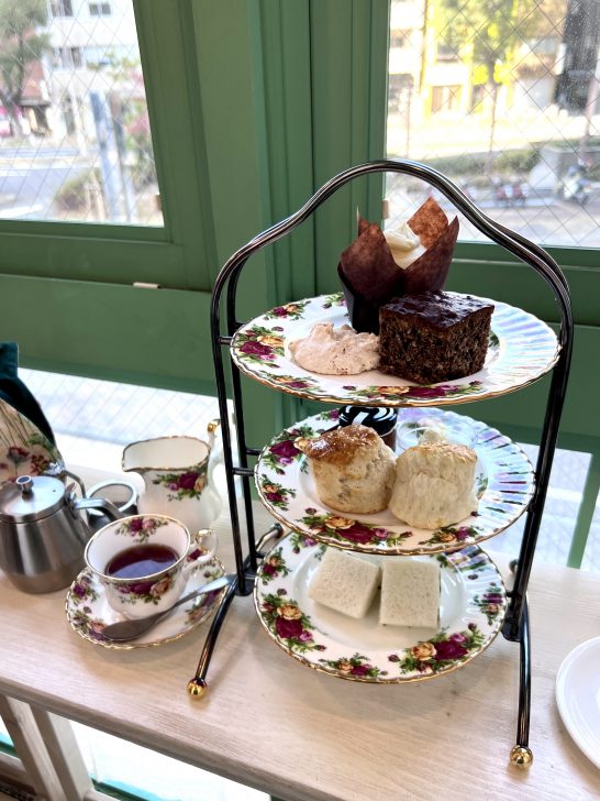 うっとり見とれてしまうティースタンドにティーウェアが、ぴったりとカウンターテーブルに寄り添います。またミントグリーンの窓枠がステキじゃないですか♡ 私の一番大好きなミントグリーン。もう最高のスペシャルシートです!