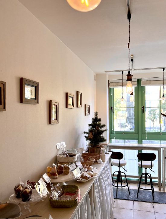 2Fの縦長の販売スペースには今日焼き立てのお菓子が並びます。山側に向いた細長いカウンタースペースでは、お好みのお菓子とお茶が楽しめます。