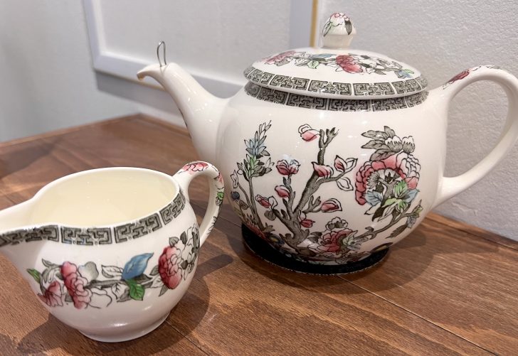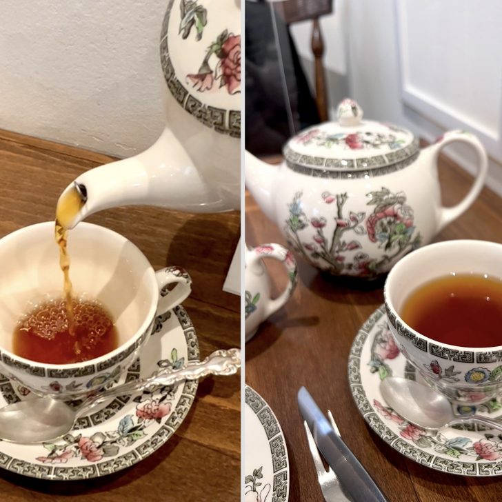 どこのブランドかわからなかったので店主さんに教えていただきました。英国陶磁器の町ストークオントレントにて、1883年創業したジョンソンブラザーズ社の「インディアンツリー」というシリーズのものです。1968年からウェッジウッドグループに入り2015年まで存在した歴史ある陶磁器ブランドです。縁部分にグリークキーと呼ばれる幾何学的なパターンが目をひきます。そしてカップに注がれたのは スリランカの紅茶 キャンディティー。深みのある水色にクセが感じられない口当たりの良い紅茶です。