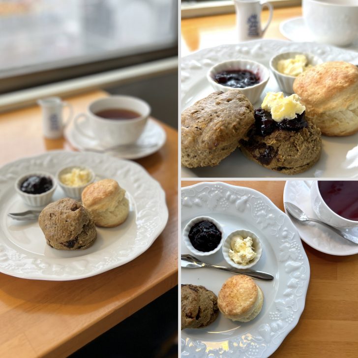 今日は新作ほうじ茶スコーンプルーン入りが登場。他にもプレーン、くるみ、レモンピール、チョコチップと並びます(心の中ではほうじ茶とプレーンと決めていた)。ジャムはいちご、マーマレード、ブルーベリーから一つ選べます(さらにブルーベリーも決めていた)。