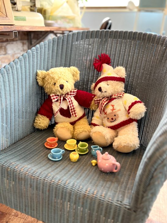 こちらのクマさんは夏は涼しげな服装で、冬には毛糸のセーターといつも格好良くティータイムを私たちと過ごします。