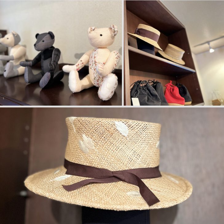 そして主力商品の帽子。夏は紫外線から肌、髪、目をまもり、冬は防寒のために大活躍する帽子は、立体感や動きがあるので個性あるファッション作りに欠かせないアイテムです。ステキな刺繍が施してあるものもありますが、実はよごれがあったり目のズレが大きかったりして正規販売できないものに、刺繍を施して蘇らせているのだとか。帽子の多くは天然素材でできていて、必ずしも材質が均一であるわけではありません。帽子材料として人の手をかけて生まれた素材が帽子にならずに終わってしまうのは残念だという思いが根底にあり、その素材の特徴を生かして色を使ってみたり、ステッチを入れたりしているそうです。