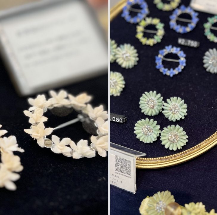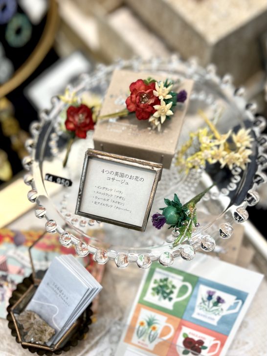 個人的に目を引いたのは布花とビーズのこちらのお店 。「布花」とは、まっさらな布から葉っぱや花びらの形を切り出し、一枚一枚のパーツを丁寧に手染めして成型したハンドメイドの造花のことをいうそうです。今回の出店にあたっては「イギリスは、イングランド、スコットランド、ウェールズ、北アイルランドの4つの“国”から構成されていて、それぞれに“国の花”があるのよ」とアティックさんから聞いたことから、4つの国花を小さなブーケコサージュに仕立てたそうです。イングランドの「薔薇」、スコットランドの「アザミ」、ウェールズの「水仙」、北アイルランドの「シャムロック(クローバー) 」。英国好きの方には気になるところですね♡