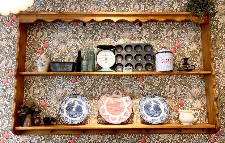 ウィリアム・モリスの壁に取り付けたカップボードにはアンティークの雑貨が並んでいます