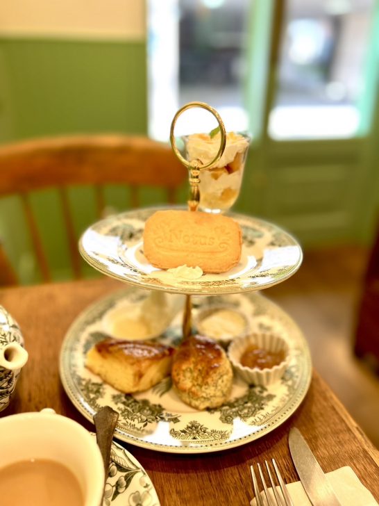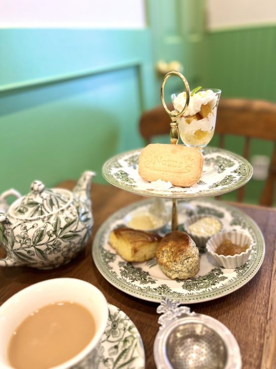 予約時間より早く行っても検査時間に変わりはないだろうと思いつつ、30分早く到着したらなんとすぐに検査スタート。あれよあれという間に終わり病院の外へ。早速、おひとり様アフタヌーンティーが当日でも可能かお店に電話しました。電車とバスを乗り継ぎ、9月に日本橋三越英国展にも出店されていたベイク&カフェ ノータスさんに向かいました。開店少し前に到着したので、可愛いミントグリーンの外観にはまだランプは灯っておらず、カーテンも閉まったまま。路地裏に面する英国菓子屋さんの静けさとは真逆に、お隣のお弁当やさんにはお客さんが大勢並び、浅草で働く活発で温かい雰囲気も感じられました。