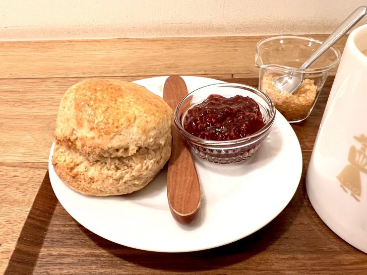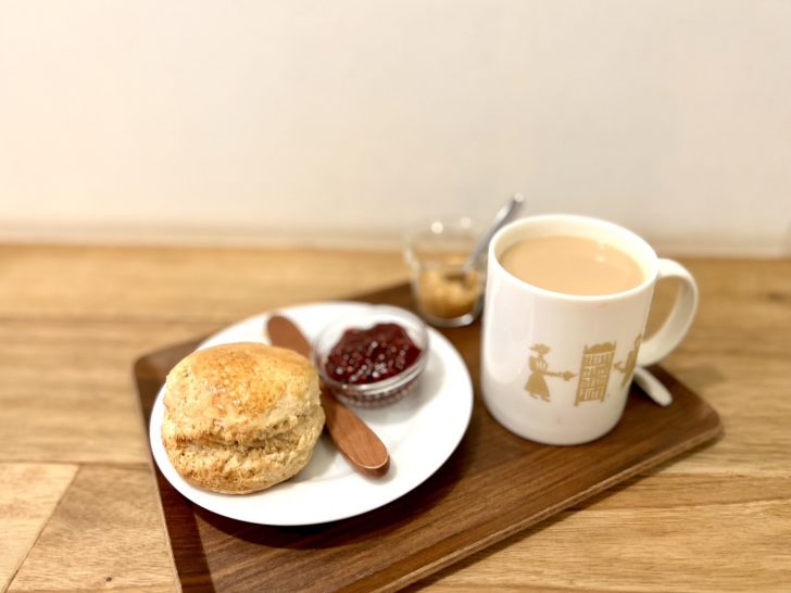 そんな懐かしい昔を思い出しながら、背中越しに聞こえるぽこぽこお湯が沸ける音、かちゃかちゃする音はカトラリーかな。心地よい音にじんわりしながら甘い香りが漂いはじめたから出来上がり。焼きたてスコーンの美味しさが頬張る前からわかります!やわらかくサクサクっという音と、サラッとした飲み心地の甘くミルキーな香りのミルクティー。