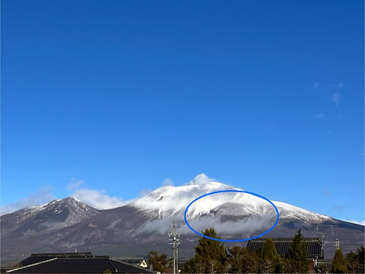 おわかりになりますか?ちょと雲がかかってわかりにくいと思いますが、これがゴリラの横顔「浅間ゴリラ」です。浅間山に冠雪した時のみ現れる軽井沢の風物詩。浅間山の溶岩が流れ着いてできた地形だそうです。