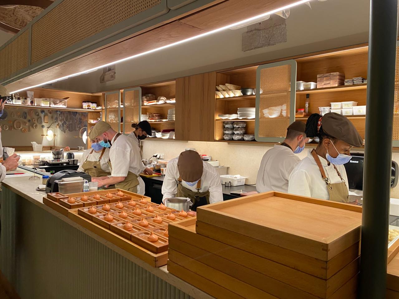 シェフのJoseが子供の頃、フルーツを木からとって食べ着ていたシャツの袖で口を拭いていたという思い出から、(オレンジのデザート)を食べる時そのまま食べてこの袖で拭いてくださいというプレゼンテーション。