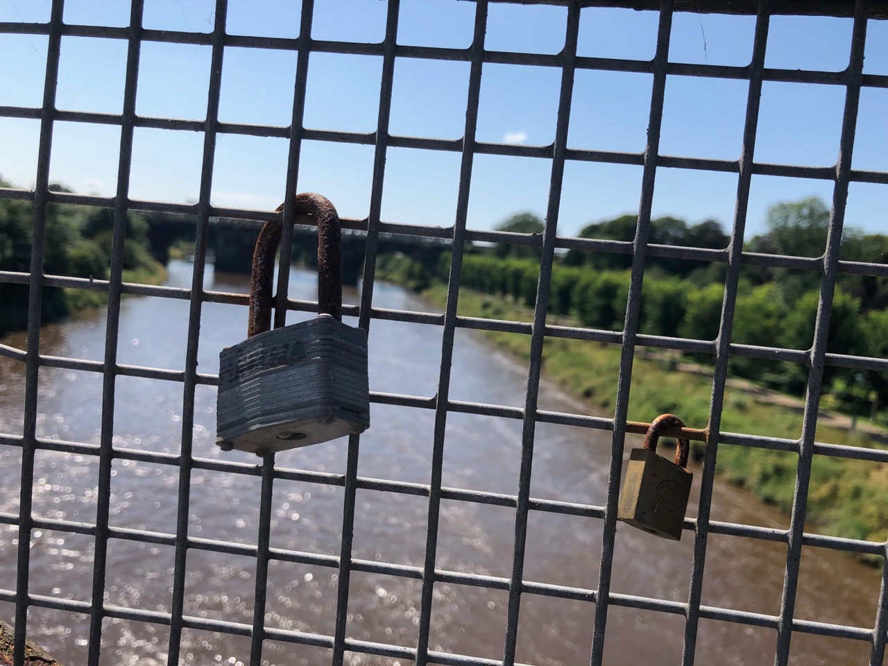川の流れに遭遇。橋の金網部分に鍵を掛けてある…誰かの願いが込められてるのであろうか?